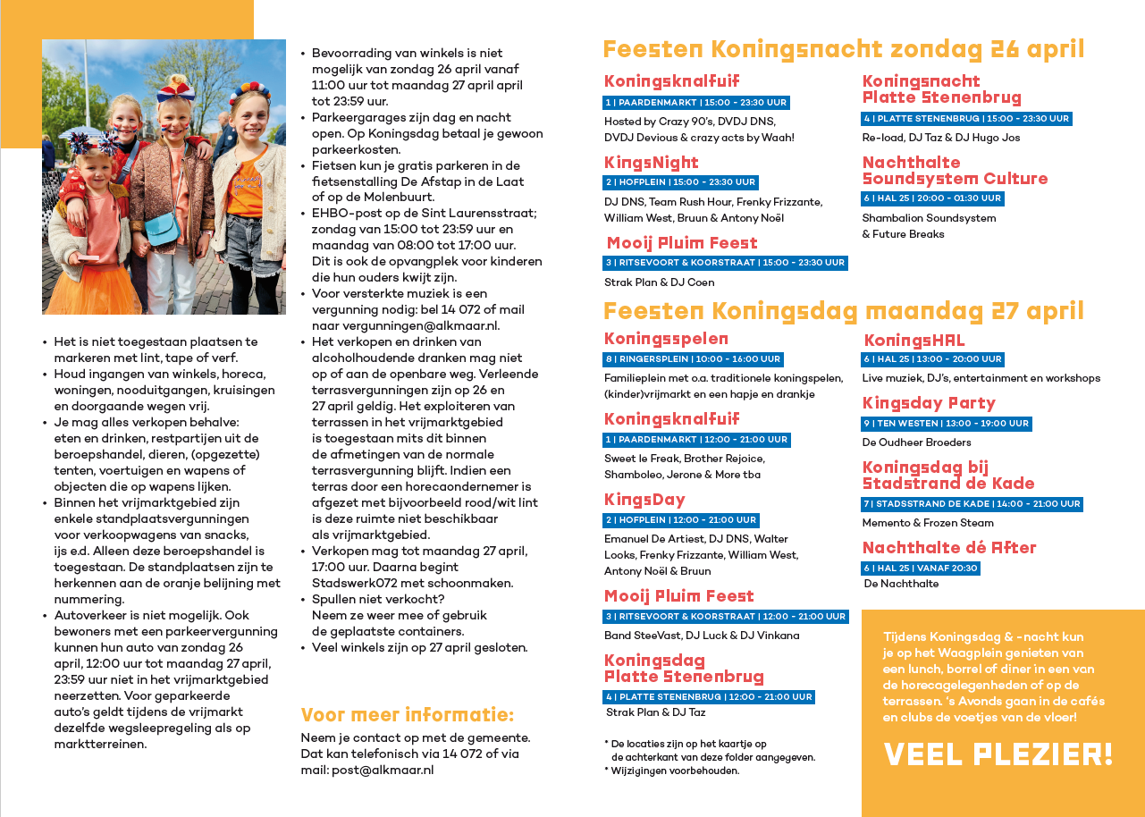 Ben je op zoek naar duidelijke informatie over de vrijmarkten en feestlocaties tijdens Koningsdag in Alkmaar? Op deze pagina vind je de officiële flyer die alles overzichtelijk weergeeft. Handig om bij de hand te houden op 26 en 27 april – zo weet je precies waar je moet zijn en wat je moet weten!